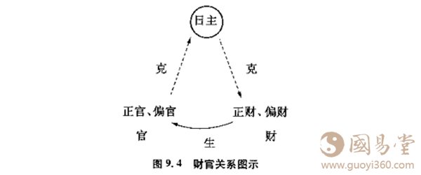 那么,代表了财富信息的“财”,它跟官是什么关系呢?在财官网络中,财居于宫前一个位置,是滋生和扶持官的。相对于日主来说,它是处于我克位置上的五行。见下图: